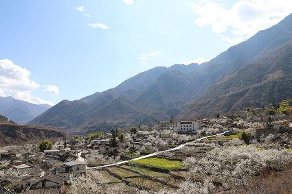 在瀘定縣冷磧鎮(zhèn)、德威鎮(zhèn)等地,桃花、油菜花及櫻花競相開放,一團(tuán)團(tuán)、一簇簇,綴滿枝頭,藍(lán)天、白云與各色花兒相交,金黃花海在微風(fēng)中起伏。一畦畦油菜花田錯落有致、層次分明,綿延不斷?!岸聶鸦ㄩ_,三月桃花盛,四月紅櫻桃,五月水蜜桃?!背擞筒嘶ǎ磕觋柎喝?,瀘定的桃花也隨著和煦春風(fēng)落滿枝頭滿樹的花芽沁著香氣,一點(diǎn)點(diǎn)溢到空氣中,香了春風(fēng),也香了整座城。