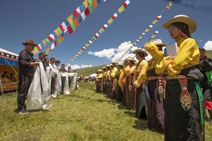 據(jù)說早在吐蕃時期,人們以村寨為單位,在本教僧人的帶領(lǐng)下高舉幡桿,手拿青棵、麥穗,繞田間地頭轉(zhuǎn)圈,祈禱神靈保佑,獲得豐收。儀式結(jié)束后,就在草場上展開角斗、斗劍、耍梭標等活動。格魯派興起后,這一活動仍得到保留,只是在繞地巡游時,人們要舉佛像、背經(jīng)文,文體活動也增加了賽馬、射箭、馬術(shù)、藏戲、民間歌舞等內(nèi)容。解放后,革去了繞地巡游等一些宗教儀軌,增加了許多休閑娛樂、物資交流的內(nèi)容?!巴?jié)”沒有固定日期,各地根據(jù)農(nóng)事而定,一般在秋收前(8月)擇吉日舉行,時間1-3天。