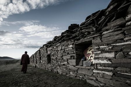 走近了,你會(huì)看見砌墻的石片上刻著密密麻麻的經(jīng)文;綿延的墻體上嵌著一個(gè)個(gè)窗口式的佛龕;每隔一段距離,石墻圍出一個(gè)回環(huán)的空間,類似于城墻上的烽火臺(tái);長墻的兩端立著高大的佛塔,中段的108座佛塔排成長長的隊(duì)伍,和長墻并行。