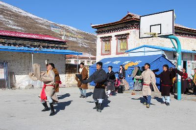 春節(jié)和藏歷新年期間,康定縣塔公鎮(zhèn)江巴村的寧靜被孩子們的歌舞聲打破了,災(zāi)后的首個寒假,孩子們回到了父母身邊,一起跳起了歡快的鍋莊,表演豐富多彩的文藝節(jié)目。