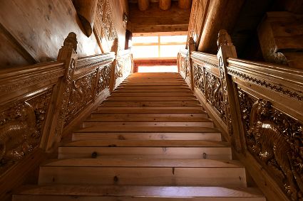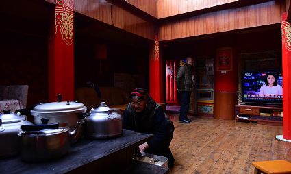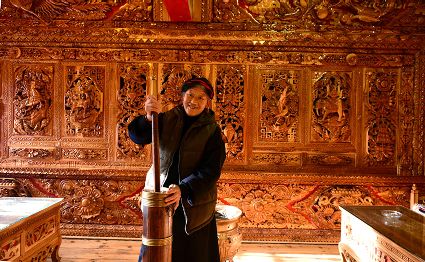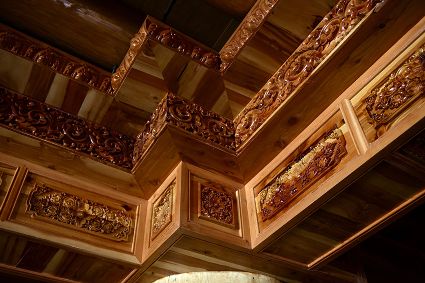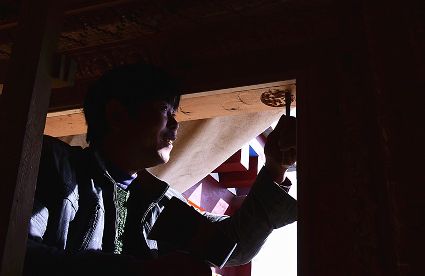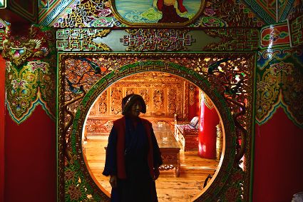 道孚民居的精華在其內部,木材是其唯一的內部裝飾材料,而裝飾,是一項繁瑣得曠日持久的藝術勞作,往往建房只需一兩個月,內部裝飾則要幾年甚至幾十年。民間建筑藝術家們沉醉在細致入微的勞作里,讓每一個圖案都盈溢一份心底的吉祥,讓每一筆描摹都傳遞一份動人的傳說。房間四壁、房門和梁柱上一般都繪滿了精致典型的藏式壁畫,窗上分別雕刻著龍、鳳、仙鶴、麒麟等吉祥圖案。每間屋的大門上都鑲嵌醒目的兩個獅頭大銅環(huán),凸顯了與之相融的漢文化的特點。置身其間,色彩斑斕中,身邊盡是龍飛鳳舞,鶴翔麟躍。繽紛中細端詳,真是藏民族藝術的天堂!