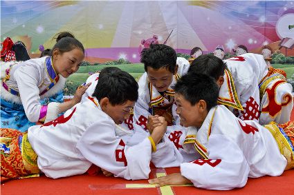 老師對(duì)將要上臺(tái)表演的盲童仁青拉姆精心妝扮。