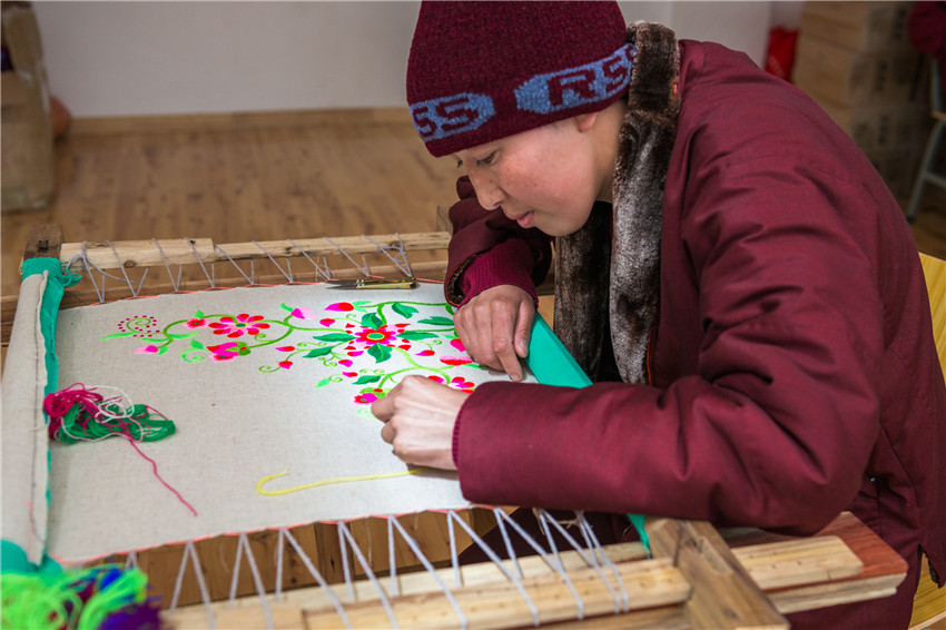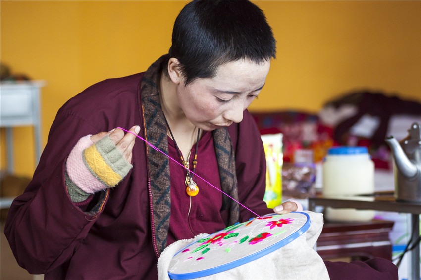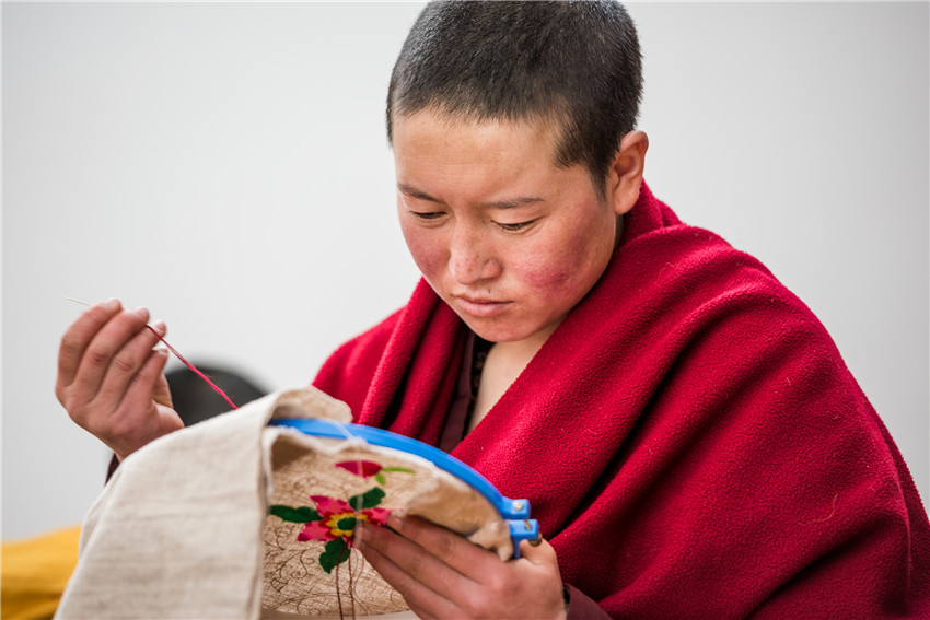 行攝途中經(jīng)過塔公鎮(zhèn)扎西寺,遇見康定市婦聯(lián)邀請到的中國國家級非物質(zhì)文化遺產(chǎn)藏羌織繡傳承人,正在為自愿報名的數(shù)十名覺姆傳授藏繡圖案基礎(chǔ)知識、藏繡圖案的常見表現(xiàn)形態(tài)、挑繡、納花繡、鏈子扣、扎花、提花、拼花、勾花和手繡等各種繡法技能。佛教的學(xué)習本是無止境的,我被這安靜、專注的場景深深感染,按下相機快門的一瞬就記錄了朵朵盛開在指尖的蓮花。