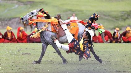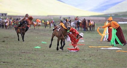 7月23日,四川甘孜藏族自治州理塘縣村戈鄉(xiāng)賽馬活動(dòng)開(kāi)始,牧民們?cè)隈R背上一顯身手。每年藏歷六月,當(dāng)草原上格?;ㄊ㈤_(kāi)的時(shí)候,四川省理塘縣24個(gè)鄉(xiāng)(鎮(zhèn))就會(huì)按照習(xí)俗舉辦隆重的賽馬會(huì)來(lái)拜祭神山,慶祝豐收。迄今有400多年歷史的賽馬分為耐力賽、小走賽、馬術(shù)賽等,其中最為精彩的是馬術(shù)賽:馬肚藏身、馬背倒立、飛騎射擊、拾哈達(dá)等,驚險(xiǎn)刺激。2008年6月,此項(xiàng)活動(dòng)被列入四川省級(jí)非物質(zhì)文化遺產(chǎn)保護(hù)項(xiàng)目。(朱虹 葉強(qiáng)平)