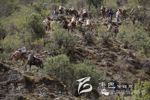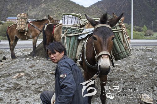 白玉縣,拉沙石的馬幫。 白玉縣,德沙村一民居內孩子在帳篷邊玩耍。