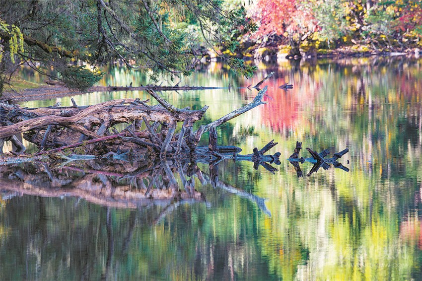 “江”與“湖”,靜臥于原始森林與草甸花海的之間,河溪清澈,湖水湛藍(lán),真如秘密花園,人間仙境。湖畔最美的是盤根錯(cuò)節(jié)的老柏樹,枝條彎曲如蒼龍,或立于湖畔,或臥于湖中,滿湖樹影、花影隨風(fēng)搖曳。