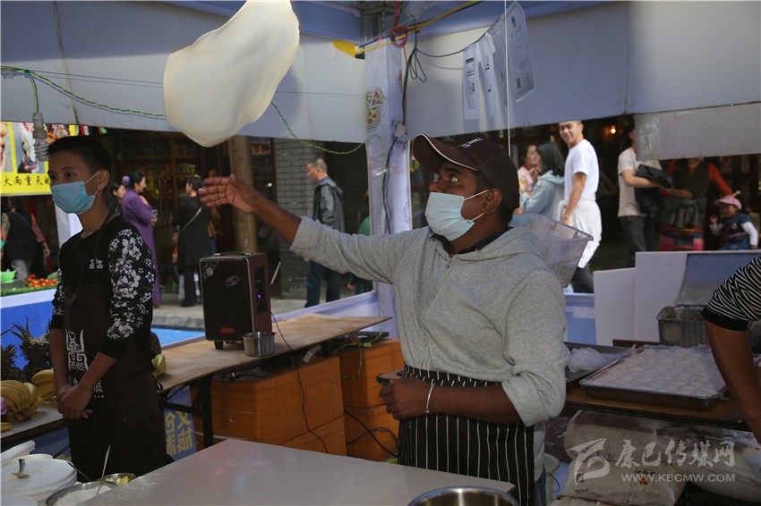 要說(shuō)美食節(jié)最炫酷的店鋪,那非“印度飛餅”莫屬了。記者穿過(guò)層層圍觀的人群,點(diǎn)了一份菠蘿飛餅。只見(jiàn)廚師將捏好的面團(tuán)在案板上揉了幾下,便捏緊面餅一端按順時(shí)針?lè)较蜣D(zhuǎn)動(dòng),手里的面餅越轉(zhuǎn)越大,越轉(zhuǎn)越薄,幾近透明,接著就是放餡料,稍做煎炸,切割裝盤(pán),短短一分鐘內(nèi),一氣呵成。記者接過(guò)盤(pán),咬下一口,“喀嚓”一聲,再一口就吃到了菠蘿的清香,外層淺黃松脆,內(nèi)層綿軟白皙,略帶甜味,好一個(gè)外脆內(nèi)嫩啊!嚼起來(lái)層次豐富,一軟一脆,口感對(duì)比強(qiáng)烈,嚼過(guò)之后,齒頰留芳。當(dāng)脆餅撞上菠蘿的清香,就像在夏天突然掉進(jìn)一個(gè)水池,清爽又驚喜?!案杏X(jué)就是一件的藝術(shù)品啊!”如此的驚嘆聲從人群中迸發(fā)出來(lái)。