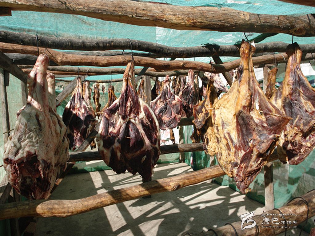 丹巴嘉絨藏族年期間,在酸菜包子、火燒饃、香豬腿等眾多的風(fēng)味飲食中,“藏香豬腿”是必不可缺的美食佳肴,也是給長輩拜年和親朋好友間互送的最佳禮品。“藏香豬腿”的制作方式也象丹巴嘉絨藏族年一樣的獨特。丹巴人宰殺年豬的方式通常有用繩索死吊或者用刀從勁入殺心臟致死兩種,現(xiàn)在采用后一種方式宰殺豬居多。當?shù)厝藢⒇i宰殺后用熱水燙,處理好豬毛,再在胸口用刀開一孔,將手伸人胸腔扯斷心肺連接處,然后將其剖開,并把肥、瘦豬肉分離開,剝?nèi)グ逵?,處理好其他?nèi)臟,將豬腿按原形分離,爾后經(jīng)霜凍、柏枝熏、自然風(fēng)干后存放在儲藏室內(nèi)。豬腿存放一冬后,色、香、味俱佳。食用時煮成半熟或用炭火將表皮烘烤,切成小塊狀或撕成粉絲狀,在百米內(nèi)即可聞到香味,入口鮮嫩清香,營養(yǎng)豐富,誘人食欲。