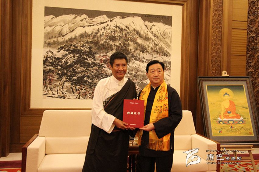 產(chǎn)業(yè)化發(fā)展的探索之路,不僅圓了年敘·多吉頓珠的“文化產(chǎn)業(yè)夢”,而且也讓他實現(xiàn)了一次華麗轉(zhuǎn)身,成為一名有擔(dān)當(dāng)?shù)钠髽I(yè)家。今年9月5日至15日,由中華文化發(fā)展促進(jìn)會、西藏自治區(qū)文化廳、西藏自治區(qū)文學(xué)藝術(shù)界聯(lián)合會、西藏自治區(qū)文化產(chǎn)業(yè)協(xié)會主辦,西藏崗地文化產(chǎn)業(yè)集團(tuán)、西藏拉姆拉綽唐卡畫院承辦的“西藏唐卡藝術(shù)——多吉頓珠、丁噶唐卡作品展“在北京中國國家博物館舉行。他和丁嘎先生現(xiàn)場向國家博物館捐贈了《釋迦牟尼》、《五方度母》、《綠度母》和《觀音》四幅精品,這是國家博物館首次收藏多派唐卡和嘎瑪嘎智畫派唐卡,填補(bǔ)了國家博物館館藏嘎瑪嘎止畫派和多派唐卡的空白。國家博物館館長呂章申先生熱情為兩位大師頒發(fā)了收藏證書并激動地說:“多吉頓珠先生和丁嘎先生捐贈的精品力作,豐富了中國國家博物館的館藏,更好地弘揚(yáng)了西藏文化藝術(shù)。國家博物館有責(zé)任把最好的藝術(shù)品收藏起來,留存于后世。”