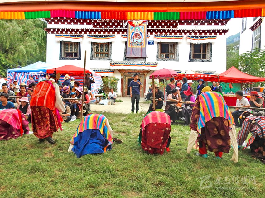 初次看到巴塘藏戲是康巴衛(wèi)視藏歷春晚,原以為是寺廟舞蹈,在唱聲杳杳里類似川劇的喉腔讓我覺得新奇,于是找些資料看看了巴塘藏戲介紹。藏戲的開山鼻祖唐東杰布。藏民歷來把他看作是創(chuàng)造藏戲的戲神和修建橋梁的鐵木工匠的“祖師”,是藏族人民心目中智慧、力量的化身。他將佛教經(jīng)典中的傳記同民間傳說、神話故事等內(nèi)容融在一起,創(chuàng)作出一種具有人物性格和舞蹈、唱腔相結(jié)合的表演藝術(shù),使過去單一的跳神舞逐漸地戲劇化,表現(xiàn)手段也不斷加強(qiáng),并從宗教儀式中分離出來,形成了藏劇藝術(shù)的雛形。