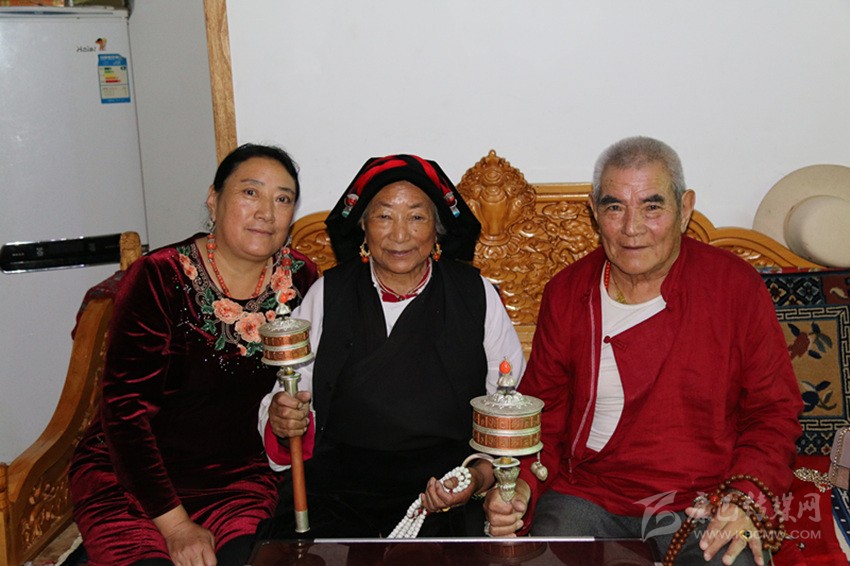 過了一會(huì)兒,兩位步履蹣跚的老人先后走了進(jìn)來。其中,一位杵著拐杖,一位搖著經(jīng)筒。“喝茶、喝茶。”見到記者一行,老人十分熱情。
