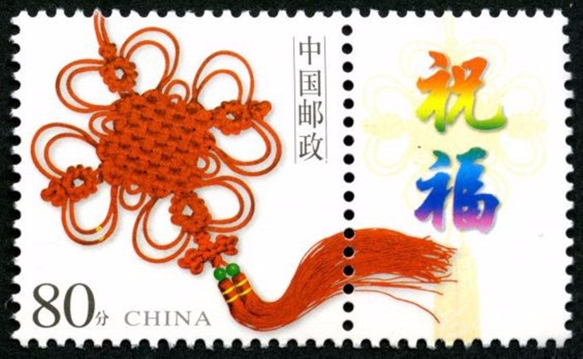 2002年5月10日,中國郵政發(fā)行《如意》個(gè)性化服務(wù)專用郵票一枚。主票圖案為如意柄端系著一個(gè)紅色“中國結(jié)”,附票有“祝?!倍?; 2003年3月3日,中國郵政發(fā)行《同心結(jié)》個(gè)性化服務(wù)專用郵票一枚。主票圖案為盤長結(jié)4邊編織有心型繩結(jié)的同心結(jié),附票為“祝?!倍?;2006年9月25日,中國郵政發(fā)行《中華全國歸國華僑聯(lián)合會(huì)成立五十周年》紀(jì)念郵票一枚。圖案為阿拉伯?dāng)?shù)字“5”與中華全國歸國華僑聯(lián)合會(huì)圓形會(huì)徽組成數(shù)字“50”,象征全國僑聯(lián)五十周年,背景畫面為淡淡的粉紅色“中國結(jié)”。寓意歸國華僑與全國人民血肉相連,同心同德共同建設(shè)美好家園;2013年8月8日,中國郵政發(fā)行一枚《美好祝?!焚R卡專用郵票,圖案為象征喜慶的紅色“中國結(jié)”;2014年9月20日,中國郵政發(fā)行《中國夢(二)——民族振興》特種郵票,其中第四枚“民族團(tuán)結(jié)”,圖案中載歌載舞的各民族群眾上方有一個(gè)大紅的“中國結(jié)”,象征著各民族大團(tuán)結(jié)。