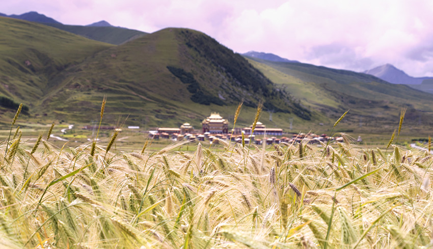 甘孜縣地處橫斷山脈的東北邊緣,康北地區(qū)腹心地帶,雅礱江從這里緩緩流過(guò),肥沃的土壤和無(wú)垠的土地總會(huì)配上澄徹晴朗的天空。一顆顆飽滿金黃的青稞常在風(fēng)里搖晃著秋天,“康北糧倉(cāng)”的美在這時(shí)展現(xiàn)得淋漓盡致。