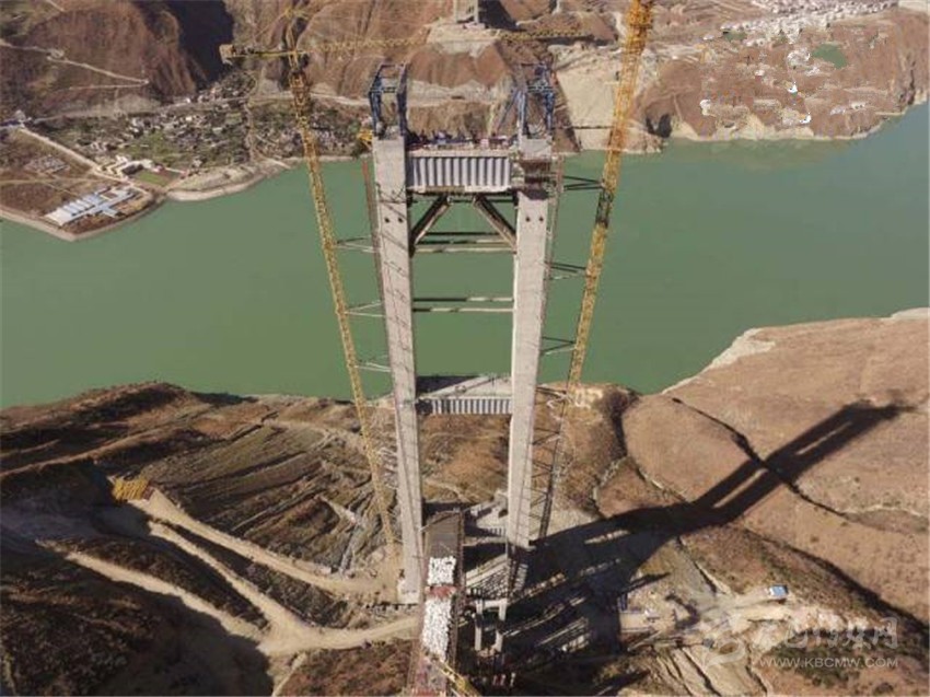 沿國道318線繼續(xù)往康定方向走,奔涌的大渡河鑲嵌在連綿起伏的山巒之間。車行一段距離后,矗立在河兩岸的兩座高聳的橋塔映入眼簾。這就是建設(shè)中的“川藏第一橋”——瀘定大渡河興康特大橋。