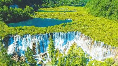 重建實踐彰顯生態(tài)理念——九寨溝景區(qū)內(nèi),尊重自然、綠色修復(fù)的舉措不勝枚舉。地震后,諾日朗瀑布出現(xiàn)一條16.8米長的裂縫,僅剩一股急流。景區(qū)就地取材,用地震中垮塌的鈣化物來填補(bǔ)“漏水”的裂縫,豐水期時,諾日朗瀑布恢復(fù)了昔日壯觀景象。