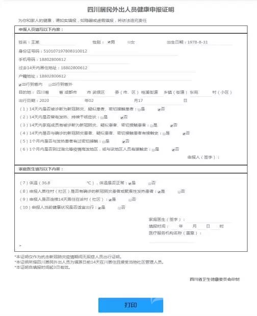 (二)服務(wù)內(nèi)容。居住地醫(yī)療衛(wèi)生機(jī)構(gòu)對(duì)申報(bào)人在開展流行病學(xué)史調(diào)查、測(cè)量體溫的基礎(chǔ)上,為符合條件的申報(bào)人出具《四川外出人員健康申報(bào)證明》。