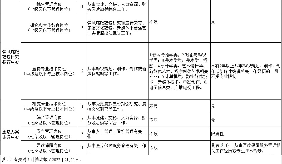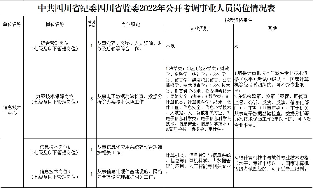 考調(diào)名額 考調(diào)事業(yè)人員25名。其中,信息技術(shù)中心管理崗位9名,黨風廉政建設(shè)研究教育中心管理崗位6名、專業(yè)技術(shù)崗位3名,金泉辦案服務(wù)中心管理崗位7名。 考調(diào)對象及條件 考調(diào)對象 全省范圍內(nèi)行政單位或參公事業(yè)單位一級主任科員(含)以下職級及相當職務(wù)層次人員;縣級及以上公益一類或全額撥款事業(yè)單位管理崗位七級及以下職員、專業(yè)技術(shù)崗位中級及以下工作人員。 考調(diào)條件 具有良好的政治素質(zhì)、專業(yè)素養(yǎng),品行端正,實績突出,群眾公認。 中共黨員。 全日制大學(xué)本科及以上學(xué)歷,并取得相應(yīng)學(xué)士及以上學(xué)位。 年齡35周歲以下(1986年2月11日及以后出生)。 歷年年度考核均為合格(稱職)及以上。 身體心理健康,具有正常履行職責的身體條件和心理素質(zhì)。 符合報考崗位規(guī)定的資格條件,詳見《中共四川省紀委四川省監(jiān)委2022年公開考調(diào)事業(yè)人員崗位情況表》(附后)。 符合法律、法規(guī)規(guī)定的其他條件。 有關(guān)時間計算均截至2022年2月11日。 具有下列情形之一的,不得報考: 被依法列為失信聯(lián)合懲戒對象的。 涉嫌違紀違法正在接受有關(guān)專門機關(guān)審查尚未作出結(jié)論的。 受過黨紀政務(wù)處分或司法機關(guān)刑事處罰的。 受到誡勉、組織處理等影響期未滿或期滿影響使用的。 按照有關(guān)規(guī)定,到定向單位工作未滿服務(wù)年限或有其他限制性規(guī)定的。 尚在試用期的。 按照相關(guān)規(guī)定應(yīng)當回避的。 法律、法規(guī)規(guī)定的其他情形。 報名及打印準考證 2022年2月22日上午8:00至2月26日下午18:00,報名人員登錄四川省人力資源和社會保障廳官網(wǎng)(http://rst.sc.gov.cn/)首頁“人事考試”專欄進行網(wǎng)上報名,每人限報一個崗位。 對報名人員進行網(wǎng)上資格初審,通過資格初審者可于2022年3月1日上午8:00至3月2日下午18:00,登陸報名系統(tǒng)打印筆試準考證。 考試 考試分筆試和面試。其中,信息技術(shù)崗位A、信息技術(shù)崗位B、宣傳專業(yè)技術(shù)崗位需加試專業(yè)測試。 根據(jù)筆試情況,擇優(yōu)確定進入面試的人選,并適時開展資格復(fù)審和心理素質(zhì)測試。資格復(fù)審、心理素質(zhì)測試、面試時間和地點另行電話通知。 考察、體檢及試用 考察 根據(jù)考試情況,擇優(yōu)差額確定進入考察對象,深入考察了解人選政治表現(xiàn)、工作能力、廉潔自律和性格特點等。 體檢 根據(jù)考察情況和職位要求,擇優(yōu)等額確定進入體檢人選,參照《公務(wù)員錄用體檢通用標準(試行)》進行體檢。 頂崗試用 綜合人選考試成績、考察情況,根據(jù)工作需要和人崗相適原則,擇優(yōu)確定頂崗試用人選。 調(diào)入 試用期滿后,根據(jù)考調(diào)名額和試用期間表現(xiàn),研究確定擬調(diào)人員,經(jīng)公示后按規(guī)定程序辦理調(diào)入手續(xù)。 注意事項 報考者應(yīng)保證提供真實、準確、全面的個人信息和資料,如有弄虛作假的行為,將按有關(guān)規(guī)定嚴肅處理。 資格審查貫穿考調(diào)全過程,任一環(huán)節(jié)發(fā)現(xiàn)有不符合考調(diào)條件的,取消考調(diào)資格。 報名時請按要求填寫本人手機號碼,并保持通訊暢通。未入圍下一環(huán)節(jié)人員,不再另行通知。 進入資格復(fù)審者,需由有干部管理權(quán)限的主管部門出具同意考調(diào)的書面意見并加蓋公章。 嚴明考調(diào)紀律,報名者不得托人說情、打招呼,一經(jīng)發(fā)現(xiàn)即取消資格。 遵守疫情防控相關(guān)規(guī)定,服從工作人員安排。 同時,四川省紀委監(jiān)委還提供相關(guān)咨詢電話:028—62555435;62555354。 (點擊查看大圖)