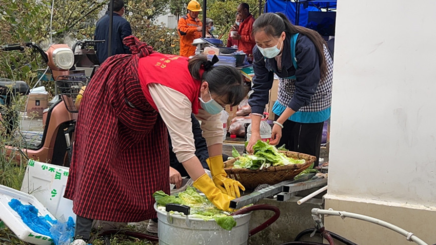 在得妥鎮(zhèn)北頭村的路旁,來(lái)自瀘定縣冷磧鎮(zhèn)桐子林村的李星芳和其他志愿者一起忙著切菜煮飯。她告訴記者,地震發(fā)生后,我主動(dòng)報(bào)名加入志愿者團(tuán)隊(duì)。“我們這個(gè)點(diǎn)上除了政府發(fā)放的物資,還有很多附近村民和好心人送來(lái)的菜肉和水果,大家都在用自己的行動(dòng)出一份力。”正在忙著切菜的志愿者洪衛(wèi)群說(shuō)。就在記者采訪時(shí),在北頭村開(kāi)飯館的易姝宏一家送來(lái)了鹵菜、排骨和新鮮蔬菜,記賬員茍有成忙著清點(diǎn)數(shù)量并記錄在冊(cè)?!暗卣鸷螅謰尠涯赀~的奶奶送到瀘定縣城孃孃家,我也向單位請(qǐng)了假,今天我們一起趕回來(lái)在這里幫忙”。