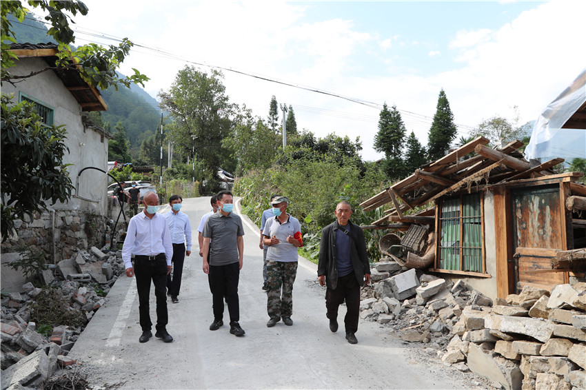 沈陽在磨子溝村察看房屋道路等損壞情況。