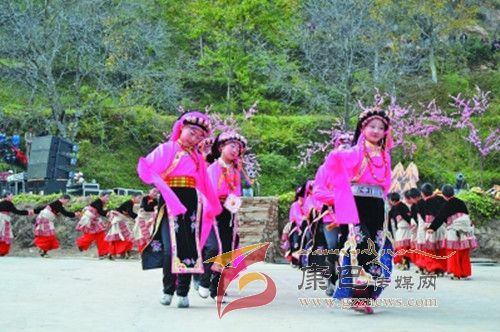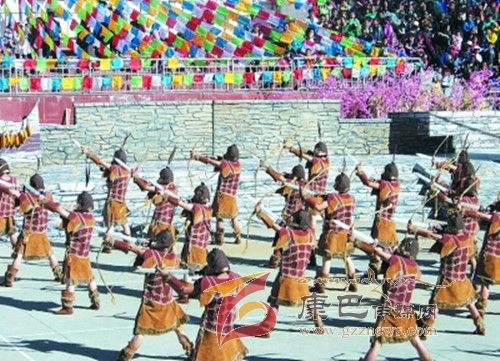 10月26日,在甲居藏寨,處處洋溢著豐收和歡樂(lè)的氣氛,人們扶老攜幼,身著節(jié)日的盛裝走到一起,來(lái)共同慶祝丹巴嘉絨風(fēng)情節(jié)的順利召開。在一塊空地中,搭建了臨時(shí)的舞臺(tái),看臺(tái)上,幾座古碉模型傲然挺立,在不遠(yuǎn)處,一座古碉矗立在一座小山包上,與古碉模型遙相呼應(yīng)、相映成趣。上午9時(shí)40分,當(dāng)節(jié)目主持人宣布嘉絨風(fēng)情節(jié)正式開始時(shí),一束束搖曳的煙花向空中飛去,在空中炸響后,散發(fā)出五顏六色的煙霧,其中有的還幻化成幾多小小的降落傘,就像多多盛開的鮮花在空中綻放。演出現(xiàn)場(chǎng)前的大地和遠(yuǎn)處的小山坡上到處都站滿了熱情的觀眾,合著禮花的爆裂時(shí)的響聲,將手中的小紅旗展開,高舉過(guò)頭頂,有節(jié)奏的左右搖動(dòng),霎時(shí)間,整個(gè)現(xiàn)場(chǎng)成為了紅色的海洋。