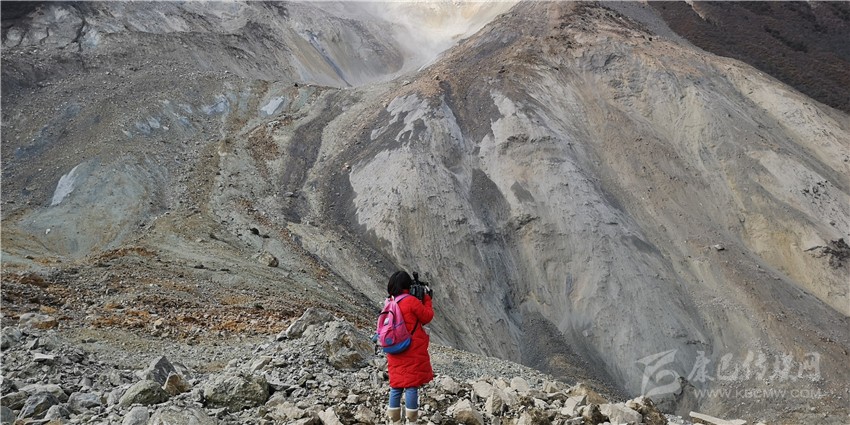 記者在堰塞湖現(xiàn)場拍攝。