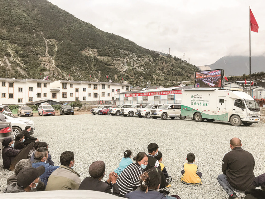 農(nóng)行甘孜瀘定縣支行與群眾在流動(dòng)汽車銀行前收看大會(huì)直播。