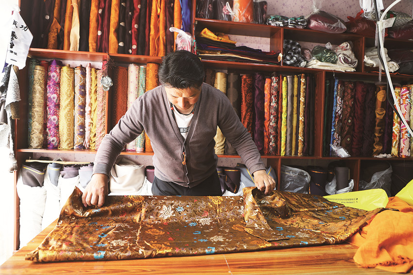 “傳統(tǒng)藏裝需要手工制作,青年、中年、老年人的款式各不一樣,料子也很有講究,還有裝飾也很重要……”說起登龍服飾,扎西澤仁神采飛揚,不時發(fā)出爽朗的笑聲,他說,“一般簡單的服裝制作僅需半天,復(fù)雜一些的要兩三天,價格從幾百元到幾千元不等?,F(xiàn)在縣城的商店生意很好,每天都能接到很多訂單,在登龍鄉(xiāng)的鋪子交給徒弟打理也完全沒有問題。”
