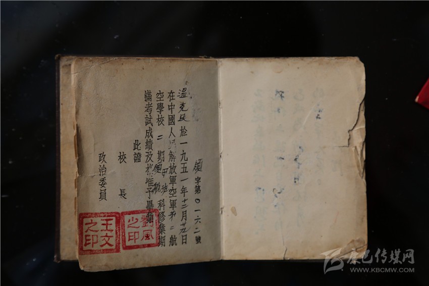 溫克棟的大兒子、57歲的溫樹(shù)平拿出大伯留下的遺物——一本中國(guó)人民解放軍航空學(xué)校畢業(yè)證書(shū)、一本中國(guó)人民解放軍空軍后勤部發(fā)的飛行裝具證、一本《中國(guó)共產(chǎn)黨黨章》、一本《中國(guó)人民政治協(xié)商會(huì)議共同綱領(lǐng)》,四本珍貴的文物書(shū)頁(yè)發(fā)黃,有的還有些微殘缺,但卻是珍貴的歷史見(jiàn)證物,溫家視為傳家寶。